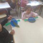 Crianças terminam a produção do planeta Terra com folhagens recolhidas no chão do gramado da escola