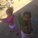 Crianças procuram folhas caídas no chão para confecção do planeta Terra