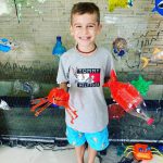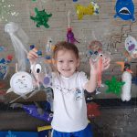 Confecção e exposição de animais marinhos feitos com plásticos.