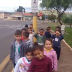 No decorrer do passeio, observamos as placas de pare, cuidado escola e vimos também a faixa de pedestre.