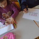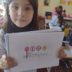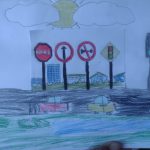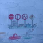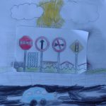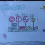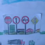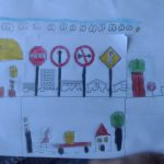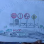 OS ALUNOS RECEBERAM O CADERNO DE DESENHO COM UMA FIGURA COM QUATRO PLACAS DE TRÂNSITO, ONDE DEVERIAM IDENTIFICAR JUNTAMENTE COM A PROFESSORA E CRIAR UM CENÁRIO DE ACORDO COM O SIGNIFICADO DE CADA PLACA.