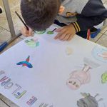 Foram realizadas pesquisas, e confecção de cartazes. Utilizaram cartolina, giz de cera, guache.