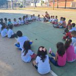 Roda para contagem de história com fantoches e figuras de animais para imitar os movimentos.