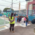 – Divisão das crianças em grupos para participar das simulações na mini cidade.