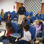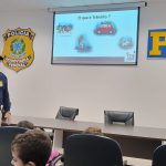 – O policial apresenta informações sobre a importância da segurança no trânsito: