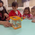 As crianças tiveram contato com um peixinho no aquário, a fim de apreciar o mesmo nadando e os cuidados que eles emanam, tal qual limpeza, alimentação, entre outros.