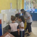 - Demonstrações Práticas: Demonstramos como usar a água de forma consciente durante a lavagem das mãos, mostrando como molhar, ensaboar e fechar a torneira enquanto ensaboa e escova
