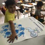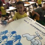 As crianças utilizaram tinta para fazer carimbos de suas mãos no cartaz, colaborando de forma ativa na construção do material visual.