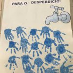 A atividade foi realizada com o objetivo de conscientizar os alunos sobre a importância da economia de água. O cartaz apresenta a mensagem “Feche a torneira para o desperdício!” acompanhada da ilustração de uma torneira e diversas mãos pintadas com tinta azul, representando simbolicamente a água.