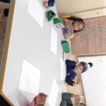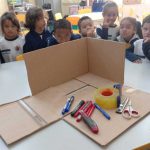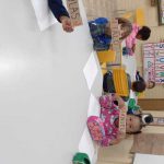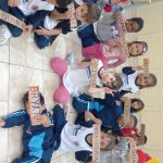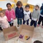 A turma confeccionou crachás utilizando papelão reciclado, destacando a importância da reutilização de materiais. Realizou-se uma roda de conversa para discutir os materiais que seriam usados. As crianças participaram ativamente escolhendo e explorando os itens. Durante a atividade, cada aluno registrou seu nome observando o próprio crachá. A proposta estimulou a consciência ambiental e a escrita do nome.