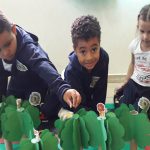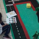 Construção de uma mini cidade, para que os alunos possam aprender brincando, com a participação dos alunos professores e funcionários. Contendo alguns item básicos de sinalização como faixa de pedestres, placas, ciclovias, etc. Alem também de deixarem uma área especifica para a floresta, onde usaram os dedoches para simbolizar os animais ema extinção e os pedestres.