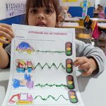Nesta aula trabalhei a coordenação motora das crianças, fazendo o caminho com os dedinhos primeiramente, pintaram os carrinhos de acordo com sua criatividade, logo após traçaram o caminho, utilizando a cola glitter verde, remetendo a cor verde do semáforo, onde os carros podem andar. As crianças amaram o brilho da cola no caminho.