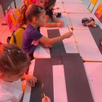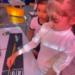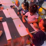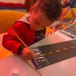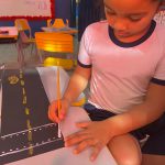Após a visualizações dos vídeos educativos, colocamos a mão na massa e começamos a criar nossa pista. Recortei pedaços de papel colorido e preto, e depois pedi para que fizesses as sinalizações das pinturas no chão, usando tinta guache. Assim poderei ensinar aos alunos na prática e brincando.
