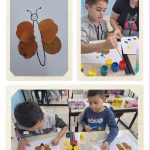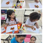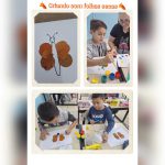 As crianças coletaram folhas secas no ambiente externo da escola e criaram borboletas colando-as sobre papel, completando o desenho com canetinhas. Durante o processo, observaram formas, texturas e tonalidades das folhas, exercitando a motricidade fina e a criatividade. A atividade também promoveu respeito e valorização da natureza como fonte de inspiração.