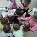 Após o plantio das árvores juntamente com Secretaria do Meio Ambiente, as crianças receberam um desafio de cuidá-las. A coordenadora solicitou para as professoras que os ajudantes do dia de cada sala ficariam responsáveis de molhá-las. Fizemos a roda da conversa e falamos do que as árvores precisam para crescer (água, sol, terra, cuidado) e por que elas são importantes para todos. As crianças acompanharam o crescimento das árvores, observaram as folhas, raízes, galhos.