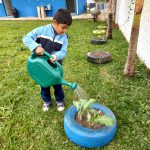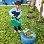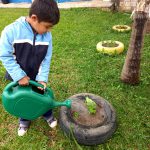 As nossas crianças são aproximadas do objeto de estudo e todos os dias uma criança é escolhida para molhar o que plantamos na escola. Esse momento é importante porque a criança se sente parte de todo o processo que foi realizado com a reutilização dos pneus e com o plantio.