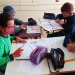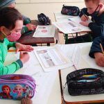 Cada grupo foi formado tinha a tarefa de realizar uma frase com um desenho referente ao Maio Amarelo.