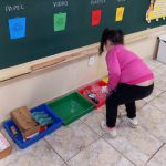 Realizamos uma roda de conversa sobre o lixo, sobre nem tudo que vai para o lixo é lixo. Para ilustrar utilizamos o clipe da música “Nem Tudo que vai para o Lixo é Lixo” do canal Mundo Bita. Depois foi disposto na sala vários materiais recicláveis e montadas lixeiras para que fossem um a um separando pelo tipo de material (vidro, papel, orgânico, metal e plástico). Também foram trabalhadas as cores das lixeiras. Para complementar realizamos a atividade em folha sugerida pelo projeto para separação de material reciclado em lixeiras ligando-os. E para registrar e divulgar na escola todo o trabalho com meio ambiente foi produzido um cartaz no qual os alunos pintaram coletivamente um gravura que representava o planeta e depois carimbaram as mãos, como segurando/cuidando do nosso planeta, do nosso meio ambiente.