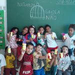 DESENVOLVIMENTO: Roda de conversa sobre o papel das aves para a manutenção das florestas. Muitos pássaros são responsáveis pela dispersão de sementes que gerarão de novas árvores, por isso não devemos manter os pássaros presos em gaiolas. Vários alunos participaram dizendo que não é legal viver preso na gaiola e que gostariam que todos os pássaros vivessem livres. Outros disseram que já viram pessoas matando passarinhos com estilingue e que isso é muito triste. Em seguida, utilizando materiais recicláveis, os alunos confeccionaram pássaros.