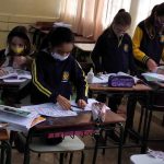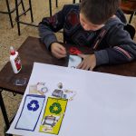 Após, os alunos formaram grupos e cada integrante do grupo ficou responsável por colorir o desenho das lixeiras de reciclagem, em seguida, os alunos procuraram no material de recorte tipos de lixos que devem ser descartados na lixeira da sua cor correta. Recortaram esses itens e ao final, o grupo juntou suas lixeiras e os lixos ou resíduos de cada uma, em um cartaz, ressaltando as cores de lixeira: amarela, azul, vermelha, verde e marrom e apresentaram ao grande grupo os ítens pesquisados.