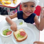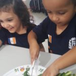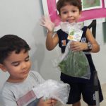 Após a colheita dos alimentos na horta como tomate, alface e couve, foram desenvolvidas receitas preparadas com a participação ativa das crianças como sanduíche, suco de laranja com couve, e couve croc-croc.