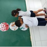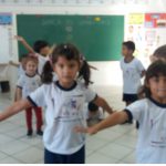 Após desenharmos o instrumento na lousa, colocamos uma música para que as crianças dançassem a cada vez que a professora mostrasse um círculo verde (o que significava movimento).