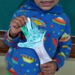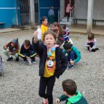 Como objetivo de pensar a reciclagem, os alunos foram motivados a trazer uma garrafa pet em outra aula para confeccionar um chocalho com pedrinhas. Foi bem interessante associar o conhecimento com a ação de cuidar do meio ambiente.