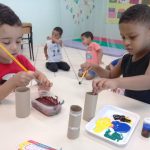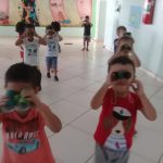 Depois, junto com seus alunos, a professora confeccionou um binóculo com material reciclável ensinando a reutilizar.