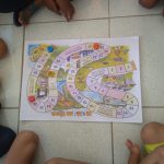 Após brincamos com um jogo onde os alunos puderam simular a direção no trânsito e estando atento as informações contidas nas casas. Utilizamos tampinhas de pet como peças para cada participante.