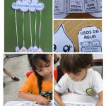 Durante a semana, conversamos muito sobre a importância da água em nossas vidas, sobre os cuidados em economizar ao tomar banho, escovar os dentes, ao simplesmente abrir a torneira ao beber água ou outra coisa. Após ler a História De onde vem a chuva, os alunos fizeram atividades referentes ao conteúdo abordado com escrita e pintura.