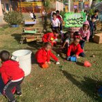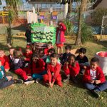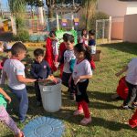 Depois organizei uma brincadeira onde essas sucatas foram espalhadas pelo jardim aqui do CEI e disse que deveriam recolhê-las para prevenir a proliferação dos focos do Aedes Aegypti.