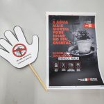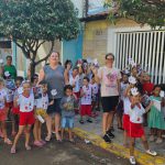 Abordamos que o mosquito da dengue pica as pessoas doentes e depois pica outras pessoas, transmitindo a doença, e que podemos nos proteger, mantendo nossa casa, bairro e a cidade limpa, sem água parada.