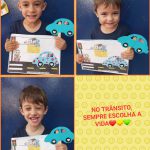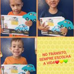 Confeccionamos um carrinho em papel para cada aluno, cada um colou sua foto no banco de trás do carro, simulando que o correto é criança no banco traseiro do carro com cadeirinhas ou assentos de elevação e cinto de segurança.