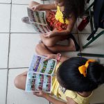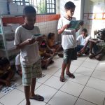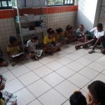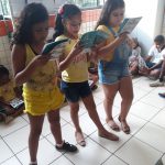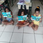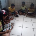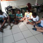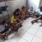 Os alunos em círculo tiveram a oportunidade de ler a revista em quadrinhos do Zé Quest e sua turma, em seguida cada um escolhia um personagem e interpretava a leitura da história.