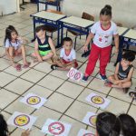 Com o objetivo de ampliar o conhecimento da turma sobre as regras e sinalizações de trânsito, foi elaborada esta proposta. A atividade teve início com uma roda de conversa, na qual as professoras retomaram, junto às crianças, os diálogos e experiências anteriores sobre o tema. Em seguida, foi apresentado um jogo para que as crianças conhecessem algumas placas de trânsito. As imagens das placas foram dispostas no centro da roda, e as professoras utilizaram um dado com figuras das mesmas placas. Durante o jogo, uma criança por vez era convidada a lançar o dado e identificar, no centro da roda, a placa correspondente à imagem sorteada. Após cada identificação, as professoras incentivavam as crianças a compartilharem suas hipóteses sobre o significado das placas e, em seguida, explicavam a função de cada uma no contexto do trânsito. A atividade proporcionou um aprendizado lúdico e participativo, favorecendo o desenvolvimento do pensamento crítico, da atenção e da cooperação, além de ampliar a compreensão das crianças sobre as regras e sinalizações de trânsito.
