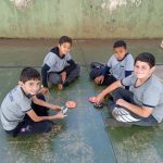 Os alunos trouxeram CD de suas casas que estavam sem utilidades, para a confecção do pião.