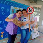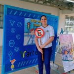 Professoras Vanessa e Sidiane com a placa de trânsito.