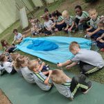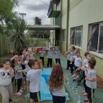 Para esta brincadeira musical usamos a boca para fazer o som de bolhas, garrafas pet com água e colheres como palhetas. As crianças experienciaram o som da batida da colher em cada lugar diferente na garrafa. Batida, batuque na tampa, no fundo da garrafa, no meio, e ao passar a colher sobre as ranhuras da garrafa como um reco-reco. Depois que ouviram e sentiram os diferentes sons, aprenderam a letra da música, cantaram e acompanharam o ritmo com os sons produzidos no tambor feito da garrafa com água. Usaram o espaço externo da escola para realizar a brincadeira.