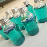 Após a observação e roda da conversa, as crianças criaram um “aquário”, usando materiais como garrafas pet e animais marinhos coloridos.