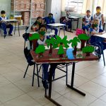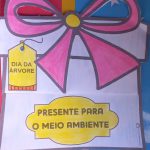 Realizamos então uma primeira atividade com um cartão presente para a Árvore, em seguida começamos a produção de uma maquete com base de isopor e E.V.A.