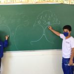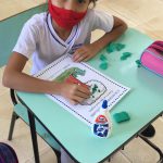 As atividades dos alunos  que estão presentes na escola devido ao ensino híbrido, ficaram visíveis em um mural, no pátio da escola. Já as dos demais alunos que não estavam em sala de aula (ensino remoto), foram compartilhadas através de fotos e vídeos no grupo de whatsapp da sala, para que assim todos pudessem participar.