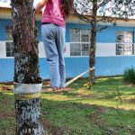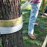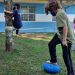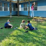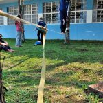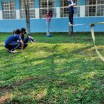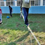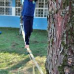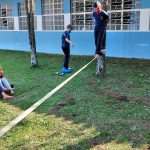 Os alunos praticaram o Slackline atravessando de uma árvore a outra onde o professor evidenciou o cuidado na instalação do material para não danificar ou causar prejuízo a natureza.