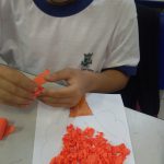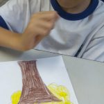 Em outro momento pintaram o tronco da árvore e colaram bolinhas de crepom para colorir e enfeitar a árvore.