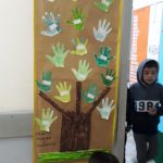 Os alunos do 2º ano C confeccionaram um painel em comemoração ao Dia da Árvore. Para fazer esse painel, primeiramente foi conversado sobre a utilidade e importância da preservação das árvores, em seguida os alunos fizeram rolinhos utilizando revistas velhas, pintaram com tinta guache, depois carimbaram as mãos para fazer as folhas.