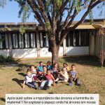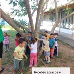 Os alunos do maternal I após ouvirem sobre a importância e cuidados que devemos ter com o meio ambiente, exploraram os locais com árvores na escola, abraçando-as, regando-as e cantando canções sobre a natureza.