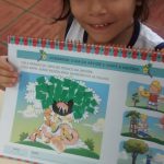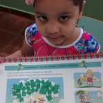 Tendo como apoio o material apostilado e retalhos de EVA a professora orientou seus alunos a enfeitar a suas árvores