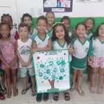 Confecção de cartaz coletivo sobre o dia da árvore , com pintura de carimbo de mãos utilizando tinta e recorte e colagem de papel .