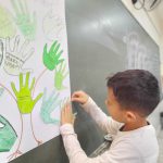 Em um outro momento, coletivamente elaboramos frases sobre a importância das árvores. Cada aluno escolheu uma frase desenhou o contorno de sua própria mão em uma cartolina, pintou de verde, escreveu sua frase dentro dela. Por fim, as “ as mãos – frases” foram colocadas em um tronco de árvore confeccionado em cartolina, representando as folhas resultando em um painel coletivo.