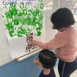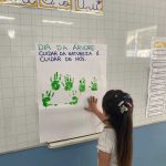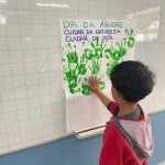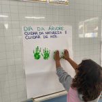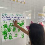 As crianças participaram da construção coletiva de uma árvore em cartaz: para formar a copa, usaram suas próprias mãos pintadas de verde, simbolizando as folhas, enquanto o tronco foi feito com pedaços de troncos de verdade. Além de estimular a coordenação motora, a criatividade e a expressão artística, a atividade promoveu uma reflexão sobre o cuidado com o meio ambiente, reforçando a ideia de que “cuidar da natureza é cuidar de nós
