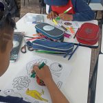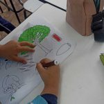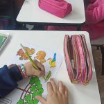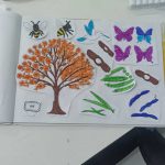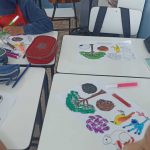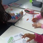 Após o vídeo, foi realizada uma atividade prática: os alunos receberam desenhos de árvores brasileiras, que deveriam ser coloridos de acordo com sua criatividade. Em seguida, cada estudante fez o recorte dos desenhos e os colou em seu caderno, como forma de registro da atividade.
